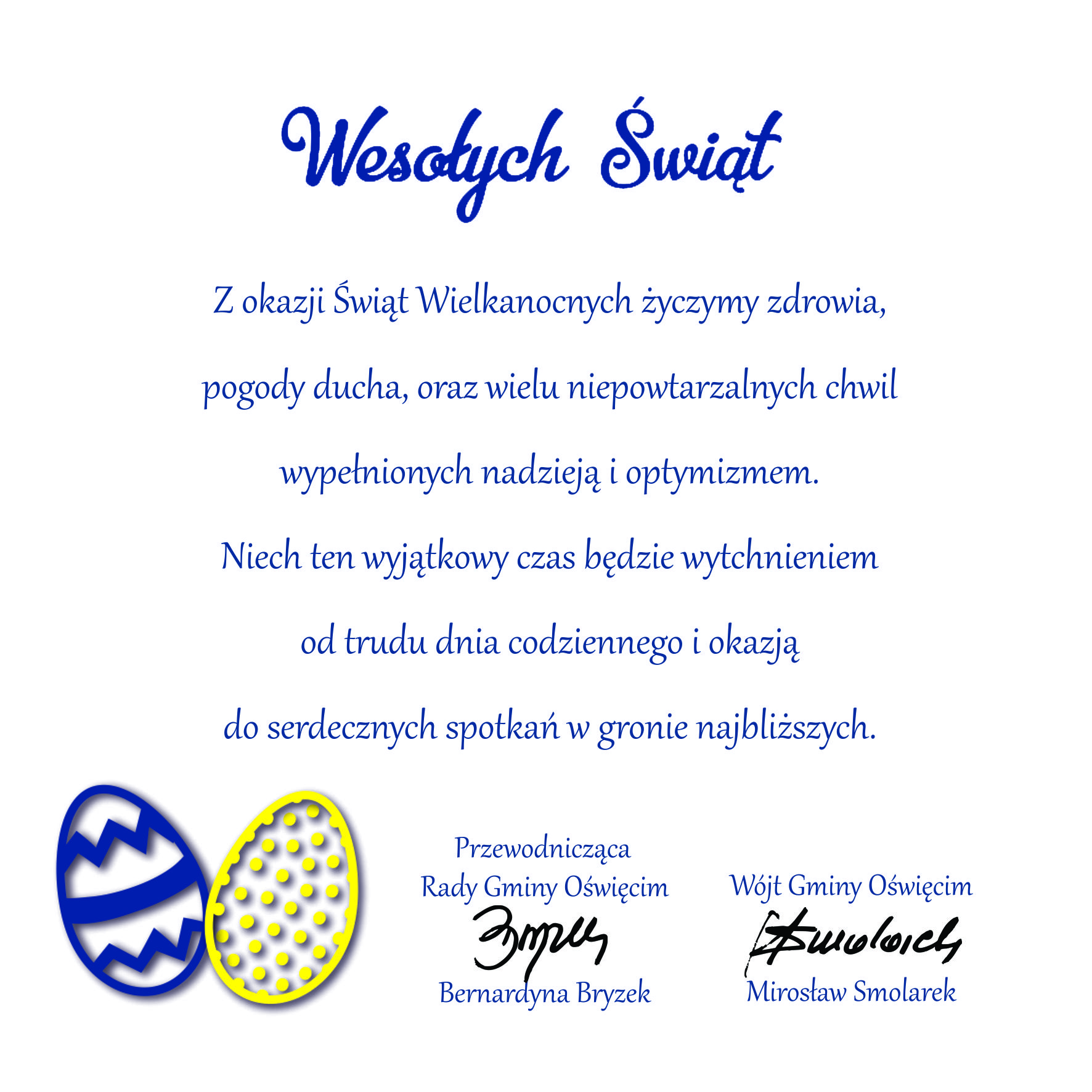 Życzenia z okazji Świąt Wielkanocnych składa Mirosław Smolarek - wójt Gminy Oświęcim oraz Bernardyna Bryzek - przewodnicząca Rady Gminy Oświęcim.