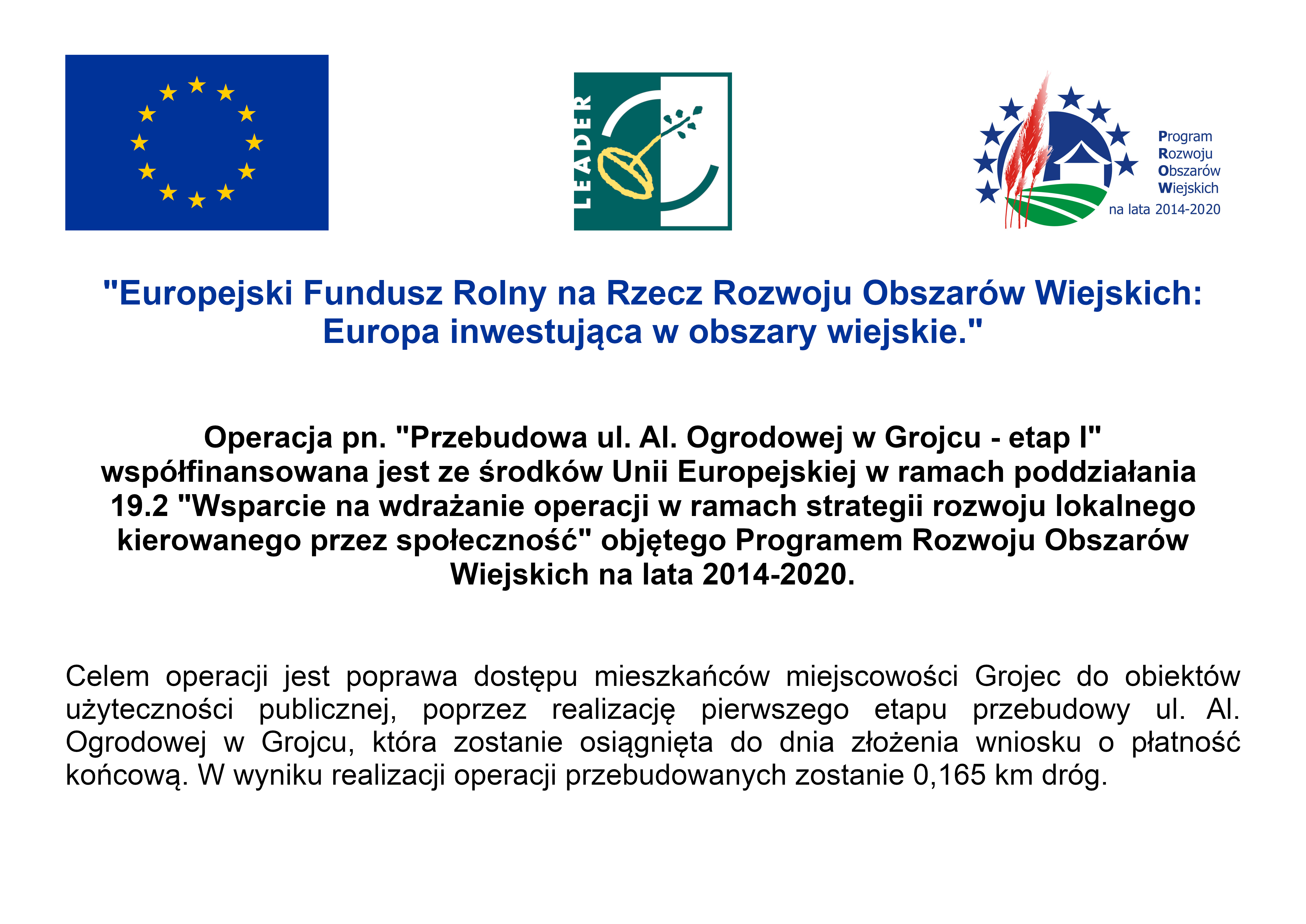 Operacja pn. "Przebudowa ul. Al. Ogrodowa w Grojcu - etap I" współfinansowana jest ze środków Unii Europejskiej w ramach poddziałania 19.2 "Wsparcie na wdrażanie operacji w ramach strategii rozwoju lokalnego kierowanego przez społeczność" objętego Programem Rozwoju Obszarów Wiejskich na lata 2014-2020.
