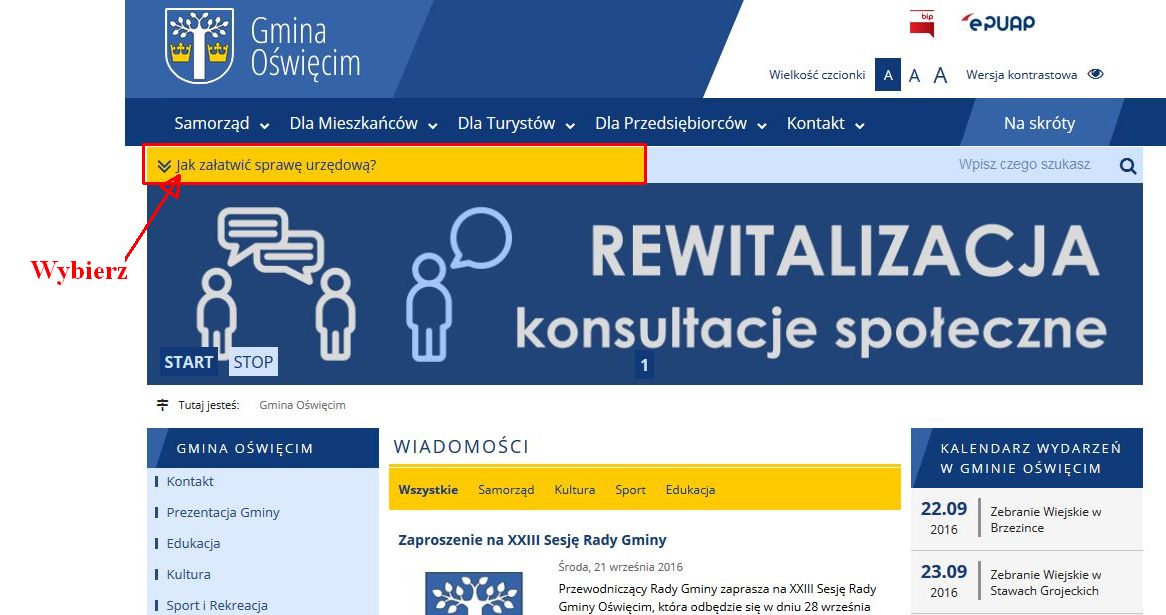 Na każdej stronie Gminy Oświęcim, jednostek podległych znajdujących się na portalu gminy Oświęcim, znajduje się link Jak załatwić sprawę urzędową? - umieszczony zawsze w tym samym miejscu, gdzie znajdziemy informację dot. sposobu załtawienia spraw urzędowych.