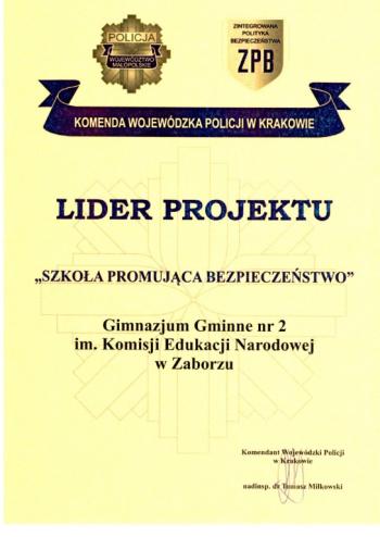 Gimnazjum Gminne Nr 2 im. KEN w Zaborzu jest pierwszym w powiecie oświęcimskim gimnazjum, które otrzymało tytuł Lidera małopolskiego programu Wojewódzkiej Komendy Policji w Krakowie „Bezpieczna szkoła”