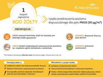 W dniu 16 listopada 2020 r. w godzinach 6:00-24:00 obowiązuje 1 stopień zagrożenia zanieczyszczeniem powietrza dla powiatu oświęcimskiego, z uwagi na ryzyko przekroczenia poziomu dopuszczalnego pyłu PM10 ze względu na zwiększoną emisję zanieczyszczeń oraz niekorzystne warunki meteorologiczne.