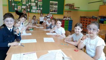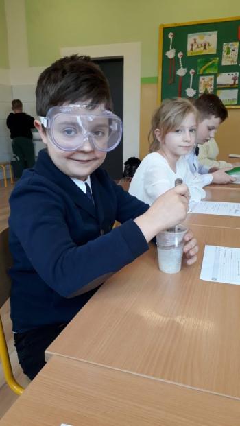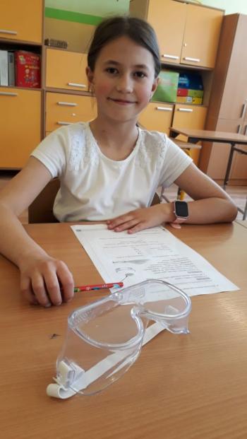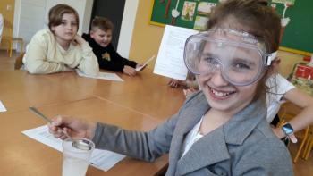 Podczas przeprowadzania doświadczeń uczniowie używali okularów ochronnych zakupionych w ramach realizacji programu #LaboratoriaPrzyszłości.