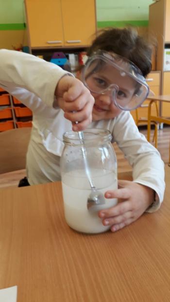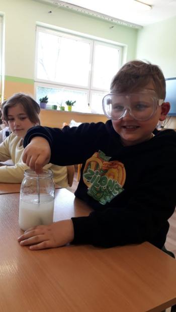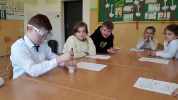 Uczniowie klasy 2a przeprowadzali proste doświadczenia z wykorzystaniem produktów spożywczych.