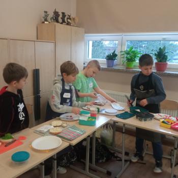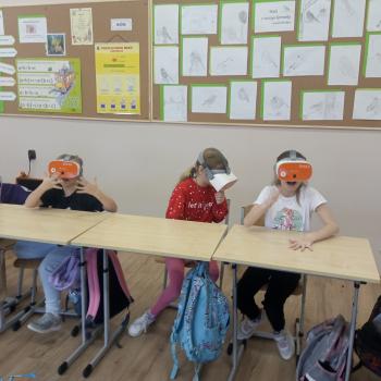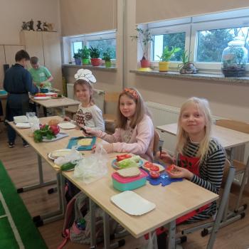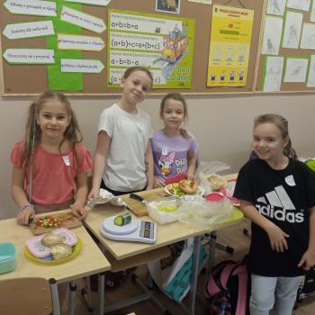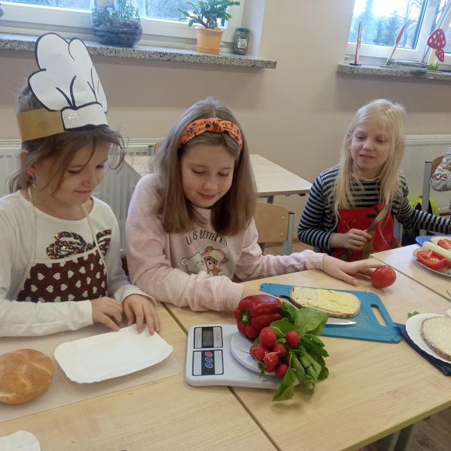 Uczniowie klasy 3b podczas zajęć technicznych przygotowywali smaczne i zdrowe kanapki. Zgodna współpraca w grupach sprzyjała kreatywności i wprawiła wszystkich w dobry nastrój. Mali kucharze wykorzystywali wagę do ważenia produktów zakupioną w ramach programu #LaboratoriaPrzyszłości. W przygotowaniu fotorelacji pomógł aparat fotograficzny Canon. Na kolejnej lekcji dzięki okularom ClassVR wszyscy wyruszyli na wirtualny bazar pełen egzotycznych owoców i warzyw oraz podziwiali owocowe kompozycje.