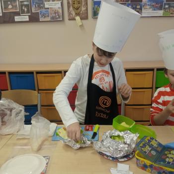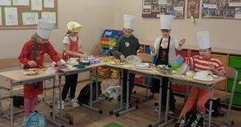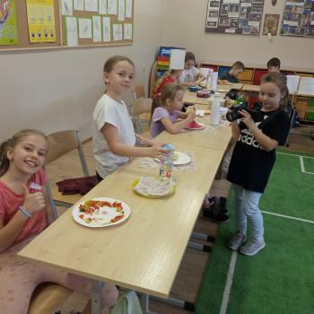 Zgodna współpraca w grupach sprzyjała kreatywności i wprawiła wszystkich w dobry nastrój. Mali kucharze wykorzystywali wagę do ważenia produktów zakupioną w ramach programu #LaboratoriaPrzyszłości. W przygotowaniu fotorelacji pomógł aparat fotograficzny Canon. Na kolejnej lekcji dzięki okularom ClassVR wszyscy wyruszyli na wirtualny bazar pełen egzotycznych owoców i warzyw oraz podziwiali owocowe kompozycje.